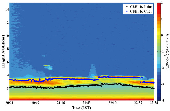 In view of the above condition, a case study at 20:00–23:00, 12 August has been analyzed. Figure 9 shows the Time–Height–Intensity diagram of WACAL observation, where the black dots and blue dots represent the retrieved CBH by WACAL and CL31, respectively. It can be found that there exists obvious difference between these two results. This may be the result of the difference on the CBH definition and retrieval methods [26]. Specifically, the improved differential zero-crossing method of WACAL regards the place where the first derivative of the lidar backscatter power changes from negative to positive as the CBH, while the CL31 regards the strongest backscattered signal point as the CBH.