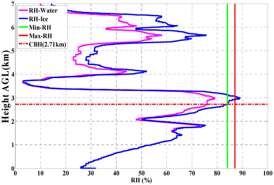 The cloud structure in this case is also retrieved using simultaneous radiosonde data and shown in Figure 10. The red and blue solid line represent the RH measured from the radiosonde and calculated from the saturation vapor pressure of ice using Equations (1)–(3), respectively. The CBH is 2.71 km using WR95 method mentioned in Section 2.2.2, and shows a good consistency with the WACAL result shown in Figure 9. It can be indicated that CL31 sometimes overestimates the CBH compared with WACAL and radiosonde, which to some extent explains the situation that WACAL CBH is smaller than CL31’s much more often than CL31 CBH is smaller than WACAL’s.
