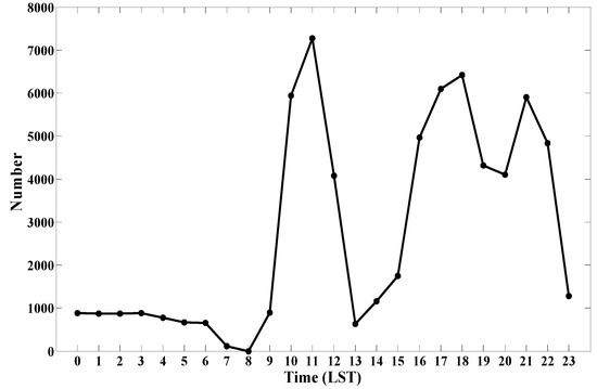 Since WACAL is not 24-h continuous observation like CL31, the data acquirability should be firstly analyzed to make the further work more reliable. Figure 11 shows the data acquirability per hour, and the x-axis represents each 1-h interval over 24 h, which is same as the Figure 5a. The time resolution of WACAL is 16 s, thus 1 h has 8325 data size in the 37-day observations from 8 July to 15 August. In this statistic, the hour with total observed number larger than 4000 is chosen to make comparison with CL31. As a result, 10 h, at 10:00, 11:00, 12:00, 16:00, 17:00, 18:00, 19:00, 20:00, 21:00 and 22:00, are selected as WACAL dataset for diurnal comparison. Moreover, the time period of 10:00–12:00, 16:00–19:00, and 20:00–22:00 can represent the cloud characteristics at forenoon, afternoon, and night period, respectively.