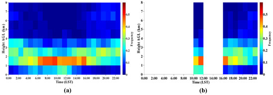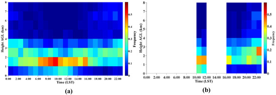 Figure 13a shows the averaged diurnal variation of CBH temporal distribution measured by CL31. The CBH frequency at a specific time period and height range, for instance, from 00:00 LST to 01:00 LST at 1–2 km, is the ratio of the profiles where CBH occurs at 1–2 km to the total profiles at 00:00–01:00 LST. It can be found that the diurnal variation of CBH frequency is similar to the CBH distribution proportion diurnal variation. In Figure 13a, the CBH frequency of low-middle cloud is obviously higher than the high cloud’s, and the high value area of low cloud occurs at 06:00–15:00. From 16:00 to the next morning, the CBH frequency of low cloud is relatively stable, ranging from 20% to 30%, while the CBH frequency of high cloud begins to increase gradually and reaches its maximum at night. Figure 13b is the averaged diurnal variation of CBH frequency measured by WACAL. Compared with CL31, both of them have a good consistency in distribution range and variation trend.