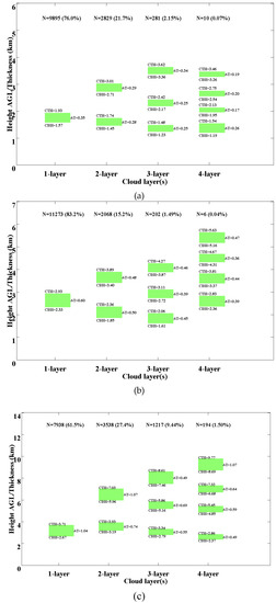 Since the detection range limitation of CL31, the cloud below 7.5 km can only be measured, and the other cloud features such as the cloud top height and thickness are unattainable. However, the WACAL can fill these gaps because of its higher laser transmitting power and receiving ability, detecting wider range and retrieving accurately the cloud features in addition to the CBH. According to the results in Figure 11, the selected three time periods can represent different cloud development processes, so the cloud spatial-temporal distribution based on these three periods can be analyzed and compared using WACAL data. Figure 14 shows the averaged spatial distribution of one-, two-, three- and four-layer clouds measured by WACAL at forenoon, afternoon and night,. The CBT, CTH, (shown with green color in Figure 14), and N represent the averaged cloud base height, averaged cloud top height, averaged cloud thickness and the occurrence number of the specific cloud type, respectively. The value in bracket presents the corresponding occurrence frequency of the specific cloud type. It can be found that the cloud mainly occurs below 4 km with relative thinner cloud thickness in the forenoon, and the cloud structure of four-layer cloud is similar to the three-layer cloud’s, while the cloud has been lifted distinctly with all clouds getting thicker in the afternoon, the spatial scale has been extended to 6 km and the cloud structure of four-layer cloud is quite different from the three-layer cloud’s, whose top cloud thickness has developed from 0.19 km to 0.47 km. Till in the evening, the cloud continues to become higher and thicker with the spatial scale extending to 10 km, and the top cloud thickness of the four-layer cloud has developed to 1.07 km, which may be the result that the cooling effect of the lower cloud is relative drastic and results in the temperature stratification instability, causing more convective condition to contribute to the cloud development. Generally, the cloud development has obvious diurnal variation with a thicker, wider, and more abundant cloud structure process.
