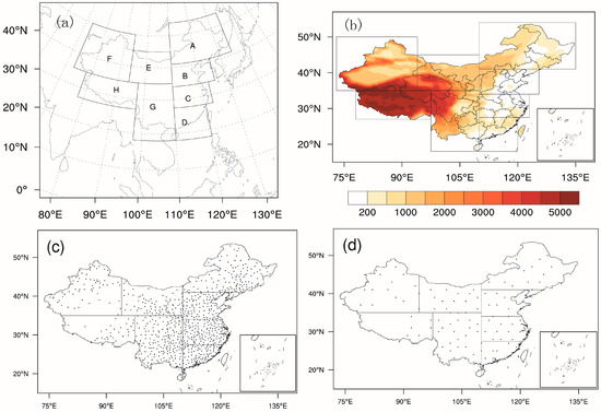 (a) Simulated domain and sub-regions map (A: Northeast China; B: North China; C: East China; D: South China; E: East of Northwest China; F: West of Northwest China; G: Southwest China; and H: Tibet); (b) simulated topography (m); (c) the location of ground stations; and (d) the location of sounding stations.