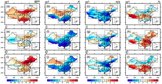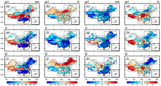 To reveal the impact of different nudged variables on the simulation of meteorological elements, the difference of simulated meteorological elements between the nudging experiments and CTL was compared. The difference field of simulated meteorological elements near the surface (seasonal accumulated precipitation, seasonal mean surface temperature, seasonal mean surface wind speed, and seasonal mean relative humidity) over the mainland China in summer 2010 is shown in Figure 2. Nudging tropospheric uv, θ, or q all had a large influence on the simulation of precipitation. The simulated precipitation was reduced with nudging θ or q in most areas (Figure 2a,e,i). In particular, nudging q had a significant impact on the simulation of precipitation in Northeast (A), and, when uv, θ, or q was nudged, the simulated precipitation increased in Tibet (H) and decreased in South China (D). For the simulation of surface temperature (Figure 2b,f,j), nudging θ had the most significant influence and resulted in the decrease of simulated temperature over almost the whole domain, particularly in East China (C). Nudging uv or q had a weak impact over the mainland China, with the exception of nudging q in Northeast (A). For the simulation of 10 m wind speed (Figure 2c,g,k), nudging tropospheric uv had the strongest influence and decreased simulated wind speed over the entire domain. The impact of nudging θ was also obvious, and nudging q only notably affected North China (B), East China (C), and South China (D). For the 2 m relative humidity simulation (Figure 2d,h,l), the simulations increased obviously in Tibet (H) when uv, θ, or q was nudged. In addition, nudging q in Northeast (A) and nudging uv in Southwest (G) also had an apparent impact on the simulations.