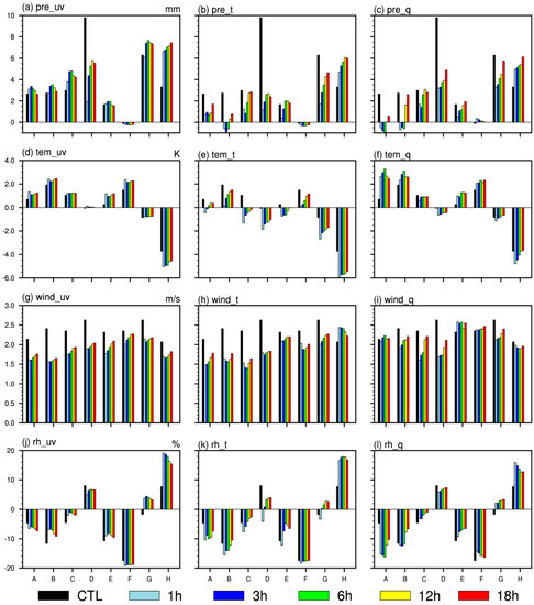 Figure 4 shows the bars for ME of simulated meteorological elements near the surface. For the simulation of precipitation (Figure 4a–c), a wet bias occurred over most areas in all experiments regardless of whether nudging was used. Nudging θ or q adopting higher nudging strength (nudging time 1 h or 3 h) extremely reduced the wet bias of precipitation, particularly in South China (D). Nudging uv did not improve precipitation simulations as perfectly as nudging θ or q except in South China (D). For the simulation of surface temperature (Figure 4d–f), the result simulated from CTL was a cold bias in South China (D), Southwest (G), and Tibet (H) and a warm bias in other areas. Nudging uv or q increased the bias, while nudging θ reduced the warm bias and increased cold bias, particularly in Tibet (H). CTL showed positive bias for the wind speed simulation. The nudging scheme effectively reduced the positive bias of simulated wind speed, and the effect was most significant when nudging time was 1 h or 3 h (Figure 4g–i). In CTL, the relative humidity simulation showed a negative bias in all areas except South China (D) and Tibet (H) (Figure 4j–l). When the nudging scheme was adopted, the simulation of relative humidity in Southwest (G) showed a positive bias conversely.