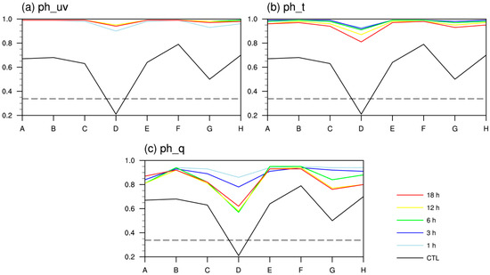 The variation of the CC between the simulated and observed geopotential height at 500 hPa in sub-regions A–H when various nudging times were adopted (the dashed line indicates the CC threshold passing significance t test at 0.1% significance level): (a) nudging uv; (b) nudging θ; and (c) nudging q.