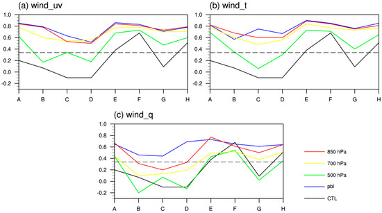The variation of CC between the simulated and observed 2 m wind with sub-regions A–H when various nudged levels were adopted (the dashed line indicates the CC threshold of significance t test at 0.1% significance level): (a) nudging uv; (b) nudging θ; and (c) nudging q.
