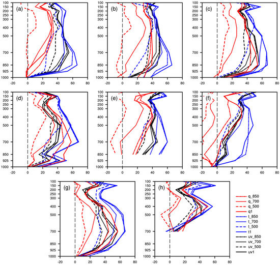 The variation of RATE (%) of simulated meteorological elements at standard sounding layers along with height (hPa) with different nudging levels: (a) Northeast China (A); (b) North China (B); (c) East China (C); (d) South China (D); (e) East of Northwest China (E); (f) West of Northwest China (F); (g) Southwest China (G); and (h) Tibet (H).