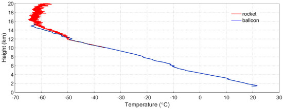 The temperature profiles (0–20 km) obtained from the rocket sonde (red) and the balloon sonde (blue).