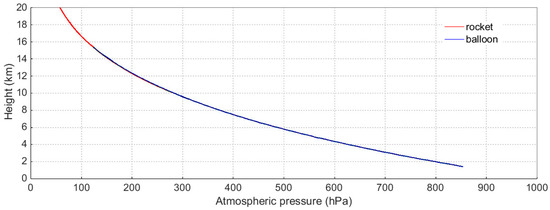 The atmospheric pressure profiles (0–20 km) obtained from the rocket sonde (red) and the balloon sonde (blue).