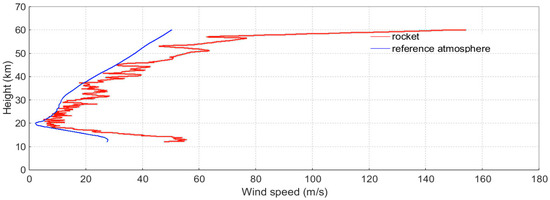 The wind speed profiles (10–60 km) obtained from the rocket sonde (red) and the reference atmosphere (blue).