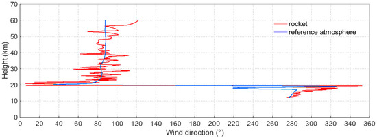 The wind direction profiles (10–60 km) obtained from the rocket sonde (red) and the reference atmosphere (blue).