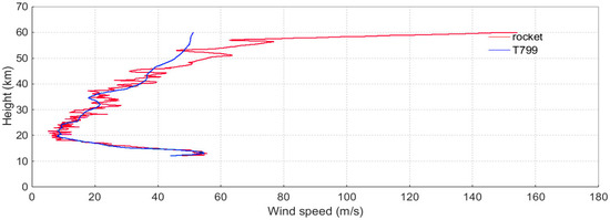 The wind speed profiles (10–60 km) obtained from the rocket sonde (red) and the T799 (blue).