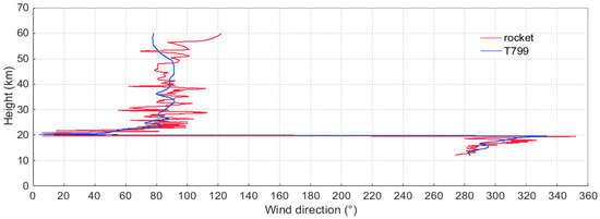 The wind direction profiles (10–60 km) obtained from the rocket sonde (red) and the T799 (blue).
