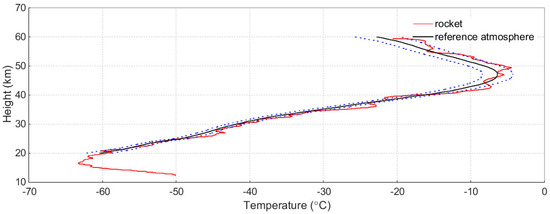 The temperature profiles (10–60 km) obtained from the rocket sonde (red) and the reference atmosphere (black). The blue dotted line represents the 3σ variance of reference atmosphere.