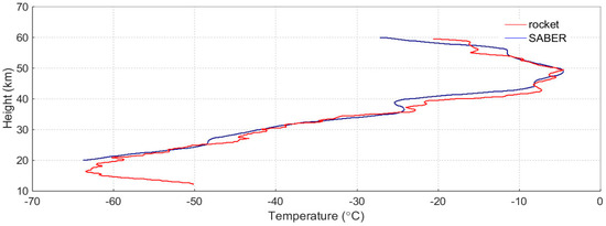 The temperature profiles (10–60 km) obtained from the rocket sonde (red) and the SABER (blue).
