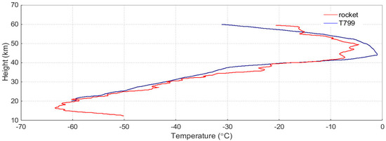 The temperature profiles (10–60 km) obtained from the rocket sonde (red) and the T799 (blue).