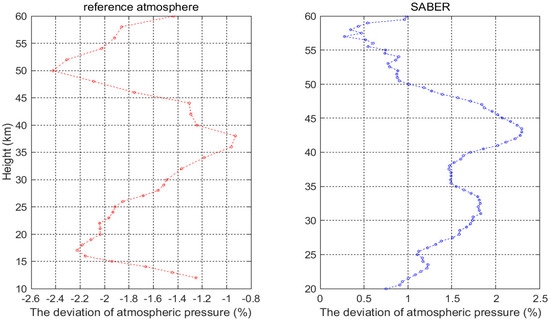 The deviation between the atmospheric pressure that was obtained from the rocket sonde and the reference atmosphere (left, 10–60 km). Also, the deviation between the atmospheric pressure that was obtained from the rocket sonde and the SABER (right, 20–60 km).