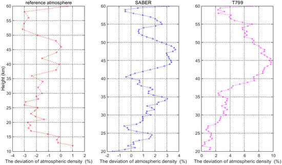 The deviation between the atmospheric density that was obtained from the rocket sonde and the reference atmosphere (left, 10–60 km), the SABER (middle, 20–60 km), and the T799 (right, 20–60 km).