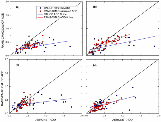 Comparisons of the monthly AERONET AOD means with the corresponding RAMS-CMAQ-simulated (red dots) and CALIOP-retrieved (blue dots) values for different seasons during the period from 2013 to 2015. (a) Spring (MAM); (b) summer (JJA); (c) autumn (SON); and (d) winter (DJF).
