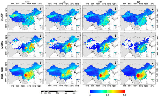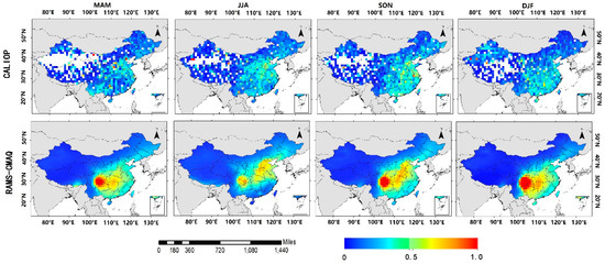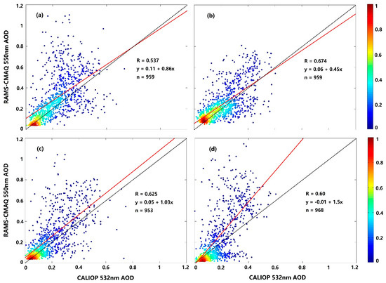 According to the seasonal results of the comparison (Figure 1 and Table 2), both the monthly CALIOP-retrieved and RAMS-CMAQ-simulated AODs of the summer show the highest correlations (R = 0.58 for CALIOP and R = 0.78 for RAMS-CMAQ) with the ground-based AERONET measurements. The slopes are 0.536 and 0.277, and the intercepts are 0.147 and 0.186 for RAMS-CMAQ and CALIOP, respectively. The lowest correlation coefficients exist in the autumn, i.e., 0.47 and 0.44 for CALIOP and RAMS-CMAQ, respectively. In most cases, the CALIOP-retrieved AODs are lower, which might be caused by the low temporal resolution and cloud interruption, especially when the AERONET AOD values are larger than 0.5 in the autumn. Moreover, both for the monthly CALIOP-retrieved and RAMS-CMAQ-simulated AODs, the data in the spring and winter are more significantly undervalued than those in the summer and autumn. In addition, both the CALIOP (spring: 0.114, winter: 0.056) and RAMS-CMAQ (spring: 0.046, winter: 0.054) data have large AOD RMSEs. Based on our analysis, the AODs retrieved from the CALIOP observations were smaller than those from the AERONET AOD measurements, which is consistent with the studies of Omart et al. [36,40]. Although the RAMS-CMAQ-simulated AODs have better agreement with the AERONET AOD values, some underestimates exist over China.