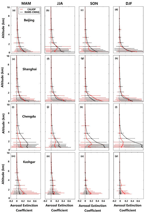 Comparison of the CALIOP measured and RAMS-CMAQ simulated AEC profiles (unit: ) in 550 nm wavelength at four seasons and locations: (a–d) Beijing; (e–h) Shanghai; (i–l) Chengdu; (m–p) and the Taklimakan desert region. The horizontal red bars indicate the + σ (SDV) of the CALIOP-derived AEC. The black bars indicate the + σ (SDV) of the RAMS-CMAQ-simulated AEC.