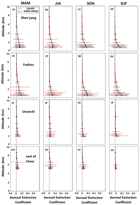 Comparison of the CALIOP measured and RAMS-CMAQ simulated AEC profiles (unit: ) in 550 nm wavelength for four seasons and locations: (a–d) Shenyang; (e–h) Fuzhou; (i–l) Urumchi; (m–p) and east of Lhasa. The horizontal red bars indicate + σ (SDV) of the CALIOP-derived AEC. The black bars indicate + σ (SDV) of the RAMS-CMAQ-simulated AEC.