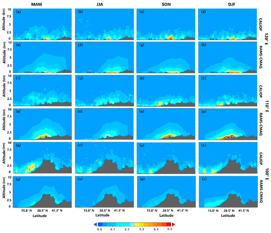 Cross sections of the seasonal mean AECs (unit: ) along 120° E, 110° E and 100° E longitudes from CALIOP and RAMS-CMAQ.