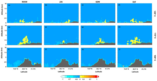 Cross sections of the seasonal differences of the AEC values (unit: km−1) along 120° E, 110° E and 100° E of RAMS-CMAQ and CALIOP.