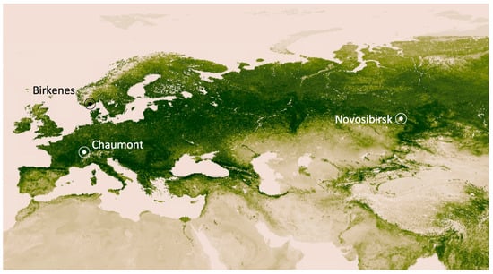 The normalized differential vegetation index (NDVI) is a proxy for green vegetation. It starts to decrease as soon as leaf senescence begins at the end of summer and deciduous trees start to shed their leaves [16,17]. We retrieved 16-day NDVI values from MODIS/Terra observations (https://lpdaac.usgs.gov/) in a circle with a 1 km radius around Chaumont, Birkenes, and Novosibirsk for the years for which time series of INP−8 were obtained.