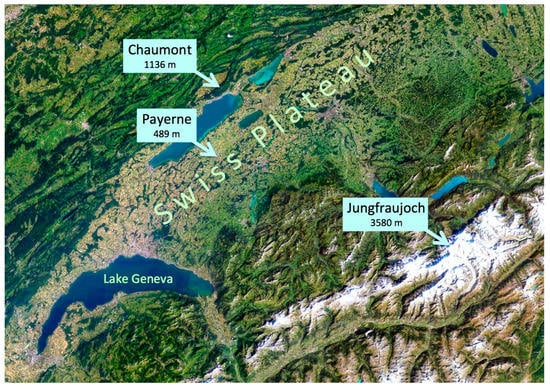 Location of the three stations constituting the altitudinal gradient. The distance between Chaumont and Payerne is 26 km; between Payerne and Jungfraujoch, it is 85 km. The background shows a satellite (Landsat) image mosaic of the western half of Switzerland [14].
