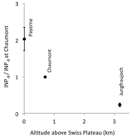 Relation between INP−8 and altitude above the Swiss Plateau, a low-elevation landscape with productive vegetation. The concentrations of INP−8 were adjusted to sea level pressure and normalized to the value observed at Chaumont on the same day. Dots represent averages of 26 normalized values; error bars show ±1 standard error.
