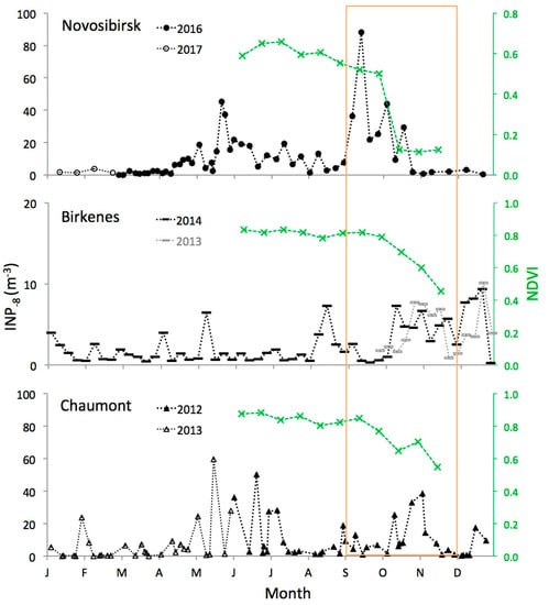Twelve-months time series of INP−8 at the locations shown in Figure 1. The series at Novosibirsk and at Chaumont are composites of data from two successive years. At Birkenes, data from the preceeding year is added (in grey) to show the occurrence of the autumn peak in a second year. The area framed in orange indicates the meteorological autumn period (1 September to 30 November). Data from Chaumont and from Birkenes are adapted from previous publications [13,15]. The normalized differential vegetation index (NDVI, green) is indicated for the summer and autumn periods of the same years in which INP−8 data was obtained.