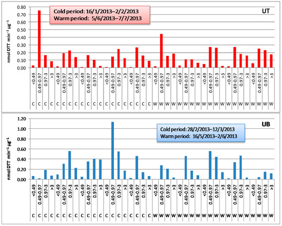 In most particle size fractions, DTT activity showed more pronounced seasonal variability at the UB site (Figure 2) with cold/warm ratios noticeably higher compared to the UT site (4.3, 1.3, 1.3, 2.2 vs. 0.4, 1.1, 1.0, 0.8 in size fractions <0.49, 0.49–0.97, 0.97–3 and >3 μm, respectively). Higher wintertime DTT activity has been frequently reported [9,24,26,27,36,53], on the contrary, other studies found higher activity in summer as compared to winter [31,44,47].