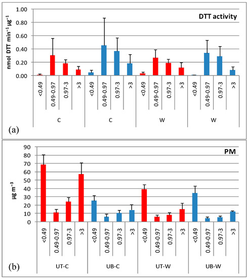 DTT activity is impacted by both local emissions associated by individual site characteristics and regional sources [36]. Some field studies carried out at different locations, with different contributing sources, found higher DTT activity at continuous traffic and underground sites [43], and/or near freeways [24]. Conversely, other studies found spatially uniform DTT activity [36,44,49]. In our study—excepting summertime particle fractions <0.49 and >3 μm, which exhibited higher DTT activity at the UT site, thus suggesting the dominant contribution of traffic emissions—DTT activity was higher at the UB site. This could be attributed to the increased biomass burning at the UB site [54].