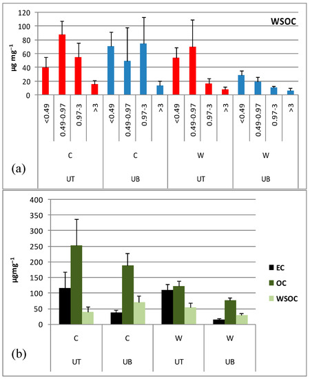 Mean ± SD of (a) the WSOC content in size-segregated PM, (b) the content of carbonaceous species in the <0.49 μm particle fraction (UT: urban traffic site; UB: urban background site; C: cold period; W: warm period).