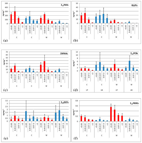 Mean ± SD of the content of trace organic compounds in size-segregated PM; (a–f) are Σ12PAHs, B[a]Py, ΣNPAHs, Σ15PCBs, Σ18OCPs, Σ12PBDEs, respectively.
