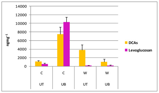 Levoglucosan, commonly considered as a suitable organic tracer for biomass burning [59], exhibited its highest content during wintertime at UB. DCAs also exhibited their highest content during wintertime at UB that is attributed to preferential origin related to biomass combustion [59]. Noticable DCAs content was also found in summertime PM0.49 at UT, suggesting possible secondary formation through photo-chemical reactions from volatile precursors emitted from vehicles [60].