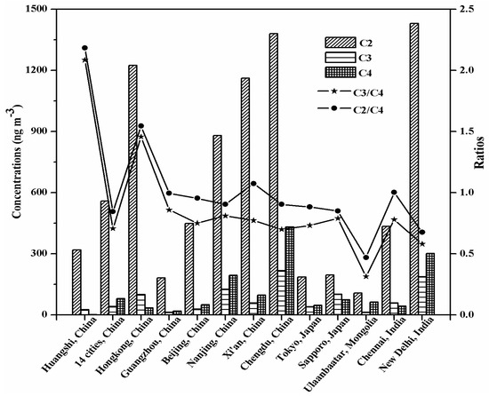 Comparison of the concentrations of oxalic (C2), malonic (C3), and succinic (C4) diacids, and mass ratios of C2/C4 and C3/C4 in the PM10 aerosols from Huangshi, Central China with the literature data for urban atmospheric aerosols. All of the ratios of C2/C4 and C3/C4 are plotted on a logarithmic scale.