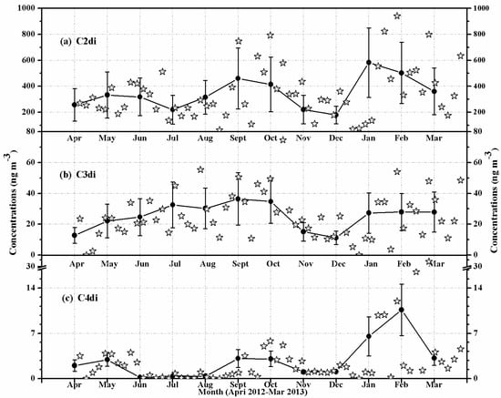 In Table 1, the concentration of C2 diacid was highest in winter (482 ± 187 ng·m−3), followed by summer (331 ± 111 ng·m−3) and spring (303 ± 100 ng·m−3), and lowest in autumn (272 ± 92 ng·m−3). C3 diacid showed the highest concentrations in summer (32.9 ± 9.08 ng·m−3), followed by winter (27.7 ± 10.1 ng·m−3) and autumn (21.8 ± 5.08 ng·m−3), and lowest in spring (21.3 ± 10.1 ng·m−3). The concentration of C4 diacid was decreased in the order of winter (7.25 ± 2.73 ng·m−3) > spring (2.53 ± 1.01 ng·m−3) > summer (2.34 ± 0.97 ng·m−3) > autumn (1.84 ± 0.78 ng·m−3). Seen from Figure 2, individual species of diacids (C2–C4) showed two different seasonal trends. C2 and C4 diacids showed maximum concentrations in winter (January, February, March) (Figure 2a,c). In contrast, C3 diacid showed maxima in summer (July, August, September) (Figure 2b). The different seasonal variations among the species suggest a difference in the sources or atmospheric processing. If the physical parameters such as lower mixing heights, surface inversion layers, and infrequent precipitations were the causes for the maximum concentrations, the concentrations of diacids should indicate the same seasonal trend [7]. Thus, the different seasonal trends between C2 or C4 and C3 diacid in HS aerosols should be caused by the difference in the emission sources or photochemical processing [10,31]. It had been reported that organic precursors that produce the compounds that showed maximum concentrations in winter are mainly aromatics and glyoxal (Gly), which can lead to the formation of C2 diacid [7,13]. Moreover, the huge emission source from coal/biomass combustion in Chinese megacities is more than seven times higher in winter than in summer [7,13,20].