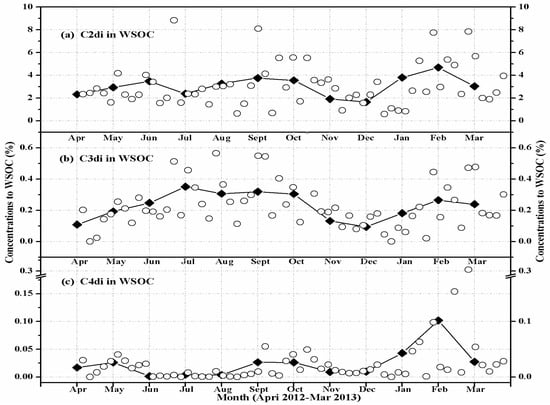 Seasonal variations in the contributions of (a) oxalic (C2), (b) malonic (C3), and (c) succinic (C4) to water-soluble organic carbon (WSOC) in the PM10 aerosols of Huangshi, Central China. The solid lines indicate monthly mean data points.