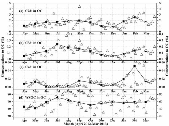 To better understand the seasonal variations of diacids (C2–C4), the carbon content of an individual diacid was normalized by water-soluble organic carbon (WSOC) (Figure 3) and organic carbon (OC) (Figure 4). The results show that WSOC- and OC-normalized seasonal concentrations are similar to the variations of diacid concentrations (Figure 2). Higher values were found in winter (January, February, March) for C2 (Figure 3a and Figure 4a) and C4 (Figure 3c and Figure 4c), suggesting an enhanced emission potentially from coal/biomass combustion. In contrast, higher values were observed in summer (July, August, September) for C3 diacid (Figure 3b and Figure 4b), which is consistent with an enhanced secondary production due to higher oxidant concentrations and warmer temperatures [10,31]. The higher values for the contribution of WSOC to OC were found in summer (July, August, September) (Figure 4d), which further implies an enhanced secondary photochemical production, although it should also exist in other diacids and the related compounds except C2–C4 diacids. From all of the above, we can conclude that the C2–C4 diacids in HS aerosols are affected both from primary emissions and from secondary photochemical processing.