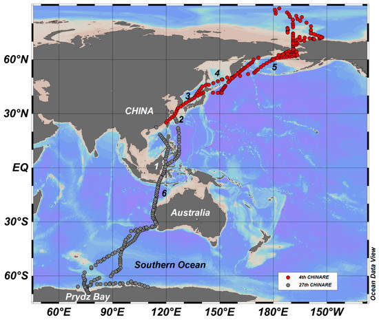 The study area is shown in Figure 1. Samples were collected along the cruise track of the 4th Chinese National Arctic Research Expedition (July–September 2010) and the 27th Chinese National Antarctic Research Expedition (November 2010–January 2011). The 4th CHINARE set out from Xiamen, China, cruised through the Japanese Sea and the Bering Strait, and sampled the Chukchi Sea and Canadian Basin. During the 27th CHINARE, R/V (research vessel) Xuelong departed from Shenzhen, China, headed southward, passing through the South China Sea, Sulu Sea, Makassar Strait, north Australia Basin, and Southern Ocean, and arrived at Prydz Bay; after the station survey, the Xuelong left Prydz Bay and returned to Shanghai, China, via a similar route.