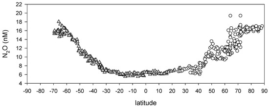 The distribution patterns of the 4th Chinese National Arctic Research Expedition (empty circles) and the 27th Chinese Antarctic Research Expedition (gray triangles). High concentrations and relatively low concentrations of N2O were observed at high latitudes and low latitudes, respectively.