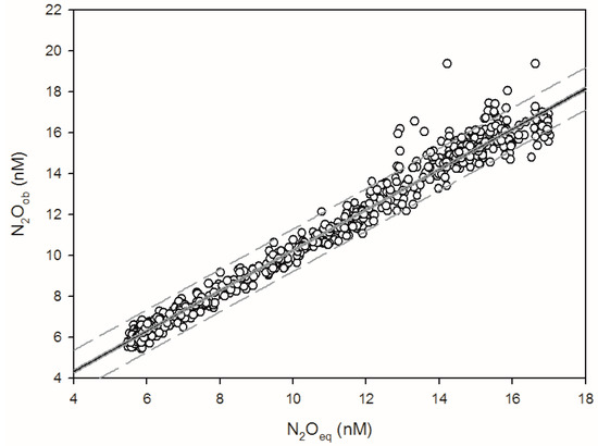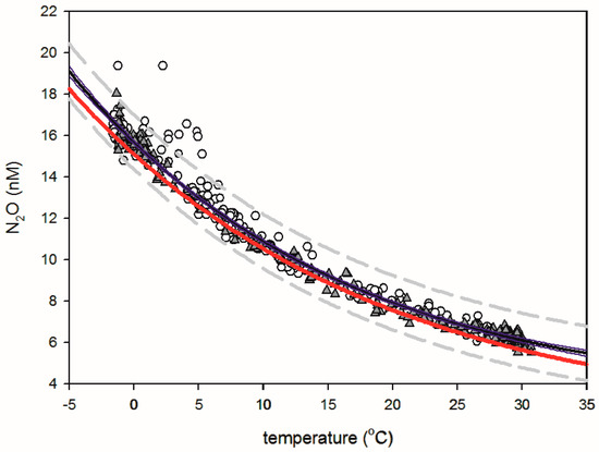 Zhan and Chen [28] documented the exponential decay relationship between the N2O concentration and surface seawater temperature (SST). In the present study, the data include those of the polar regions, which are plotted against SST and shown in Figure 3. Figure 3 shows that the correlation between these two datasets is significant (p < 0.0001), and the R2 is 0.9881, which is higher than that of 0.78 reported by Zhan and Chen [28]. The lower R2 of the latter regression may be due to the limited number of N2O samples and field SST and SSS data (used to calculate the N2O concentration) available to Zhan and Chen [28]. There are some data above the 95% prediction band, which are from the Bering Strait during the 4th Arctic Expedition.