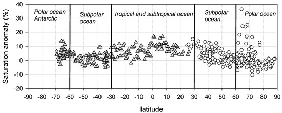 Saturation Anomaly values along the cruise tracks of the 4th Chinese National Arctic Research Expedition (empty circles) and the 27th Chinese Antarctic Research Expedition (gray triangles).