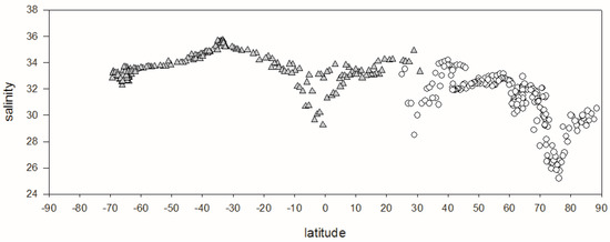 Surface salinity along the cruise tracks of the 4th Chinese National Arctic Research Expedition (empty circles) and the 27th Chinese Antarctic Research Expedition (gray triangles). Low salinity is identified near the Equator, at 30° N and at 75° N. The first two low salinity regions are influenced by river runoff, and the third may be influenced by ice melt water and river runoff.