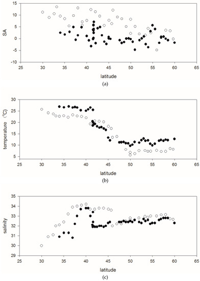 There were two cruise tracks between 30° N and 60° N during the 4th CHINARE. R/V Xuelong set out from Shanghai, passed through the Japanese Sea and Okhotsk Sea, then headed to the Bering Sea in early July. After finishing the survey in the Arctic Ocean, the Xuelong returned to Shanghai via the western Bering Sea, western Pacific Ocean, and Japanese Sea, arriving in Shanghai in mid-September. Clear SA differences exist between Shanghai and the Aleutian Arc. The outbound cruise track shows a high SA value range between 1% and 14%, whereas the return cruise track shows an SA range between –5% and 7% (Figure 7a).