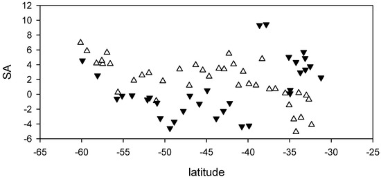 Distribution of SA values along the southward (solid triangles) and northward (open triangles) tracks of the 27th Chinese Antarctic Research Expedition.