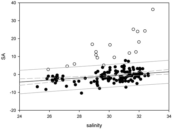 Correlation between SA and salinity in the Arctic Ocean. The open circles represent the stations associated with the N2O hotspot on the continental shelf. The solid dots represent the stations less affected by the continental shelf hotspot. The SA and salinity of the solid dot stations are significantly correlated with each other in this region.