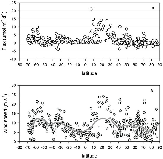 The N2O air-sea fluxes along the cruise tracks were calculated using Equations (2)–(4). The air-sea flux distribution pattern is shown in Figure 10a. The largest air-sea flux occurs in the tropical and subtropical regions defined in this study and is approximately 21.0 ± 4 μmol·m−2·d−1, observed near 10° N. Between 10° N and 30° N, the highest air-sea flux is approximately 14.8 ± 2.8 μmol·m−2·d−1; however, no high N2O air-sea flux is observed in the southern part of the tropical and subtropical areas (0° S–30° S). In the subpolar regions (30° S–60° S and 30° N–60° N), the air-sea flux in the north again shows a higher value than that in the Southern Ocean. Nevertheless, near the boundary between the southern polar and subpolar regions, a maximum air-sea N2O flux of approximately 10 μmol·m−2·d−1 is observed. Notably, the air-sea N2O flux of the northern polar region is not higher than that of its southern counterpart; instead, it shows a lower flux than that of the south, suggesting that the southern polar region may be a more important source to the atmosphere than the northern polar region. South of 60° S, the air-sea N2O flux reaches values higher than 5 μmol·m−2·d−1, which is higher than in the northern polar region, except for the relatively high flux over the Chukchi Sea continental shelf (~70° N).